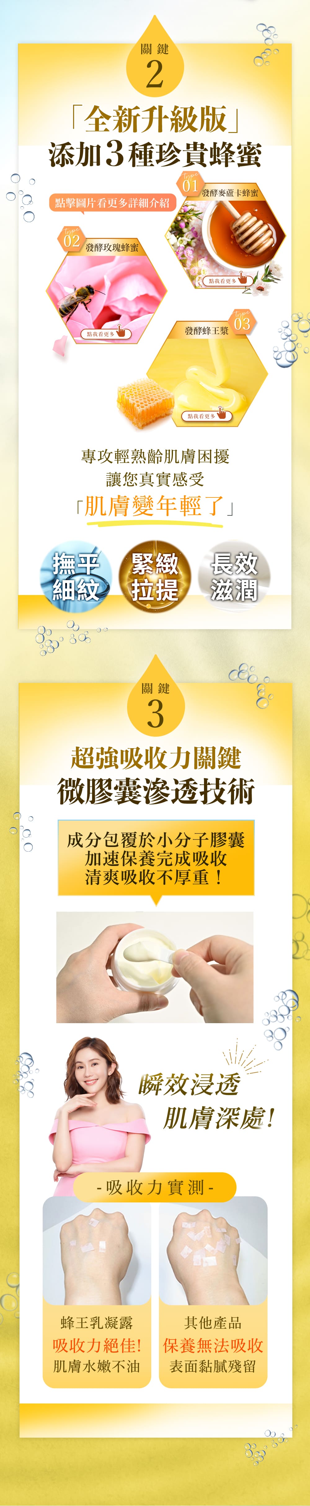 富含54種精選美容成分,並添加3種珍貴蜂蜜,可以加強對抗老化。