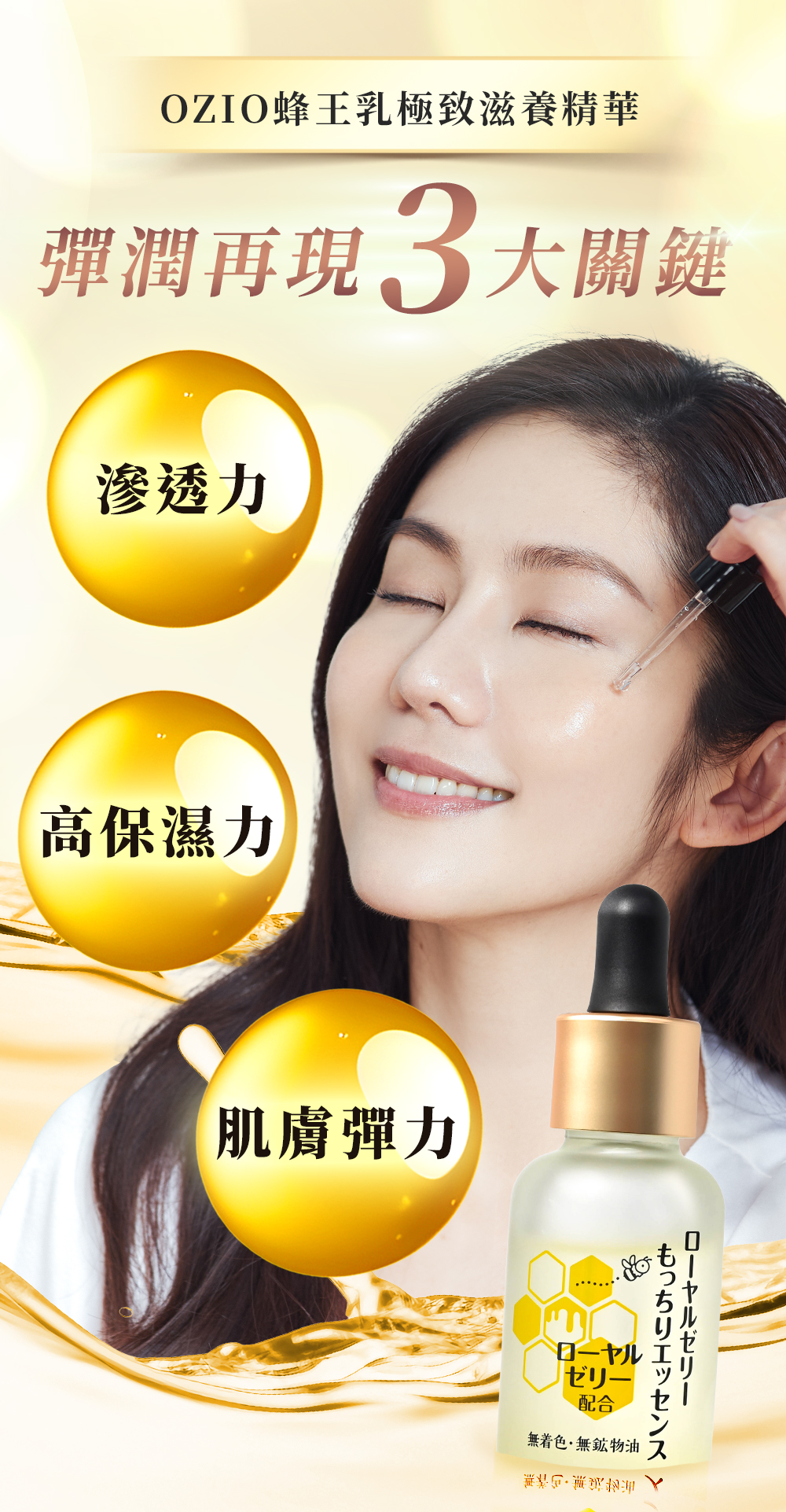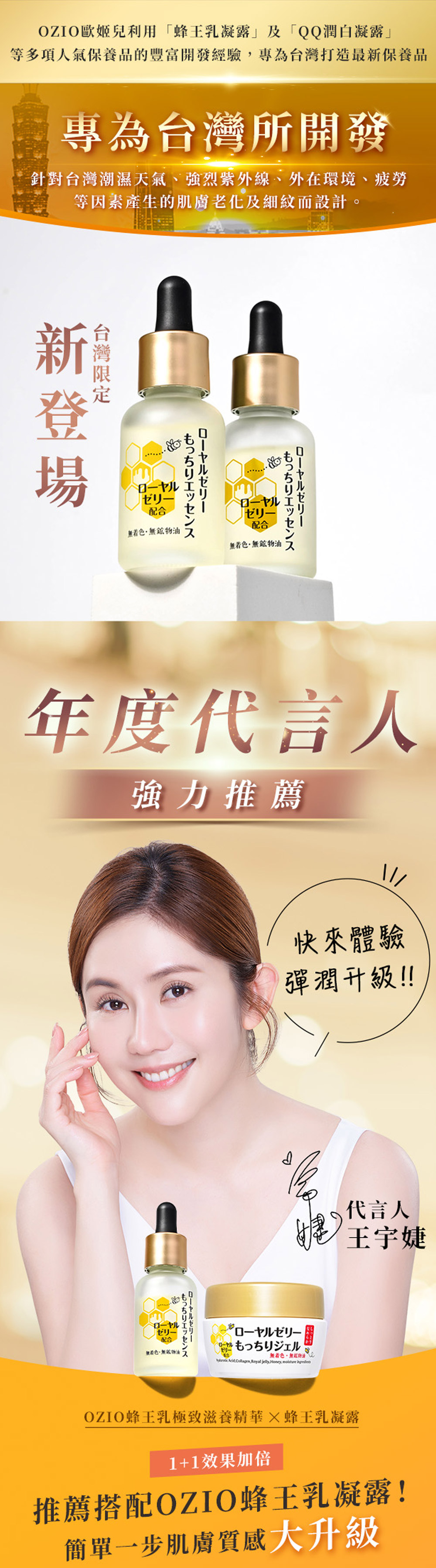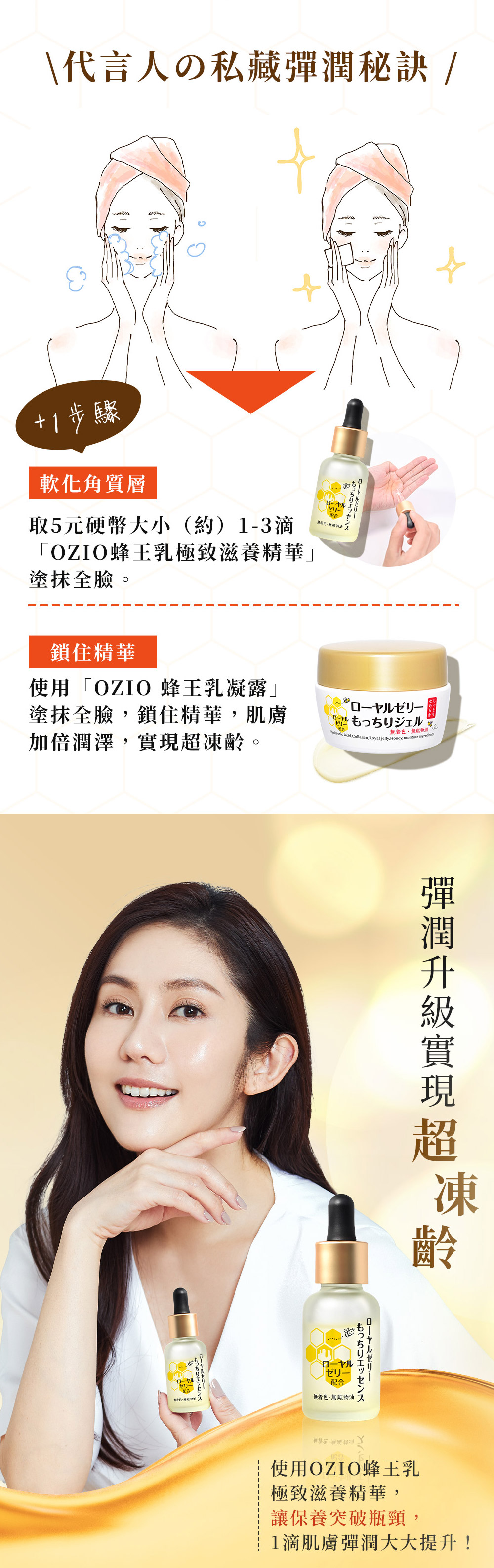 OZIO 蜂王乳極致滋養精華保養前加一滴、極致彈潤,實現超凍齡。搭配蜂王乳凝露效果更加乘。