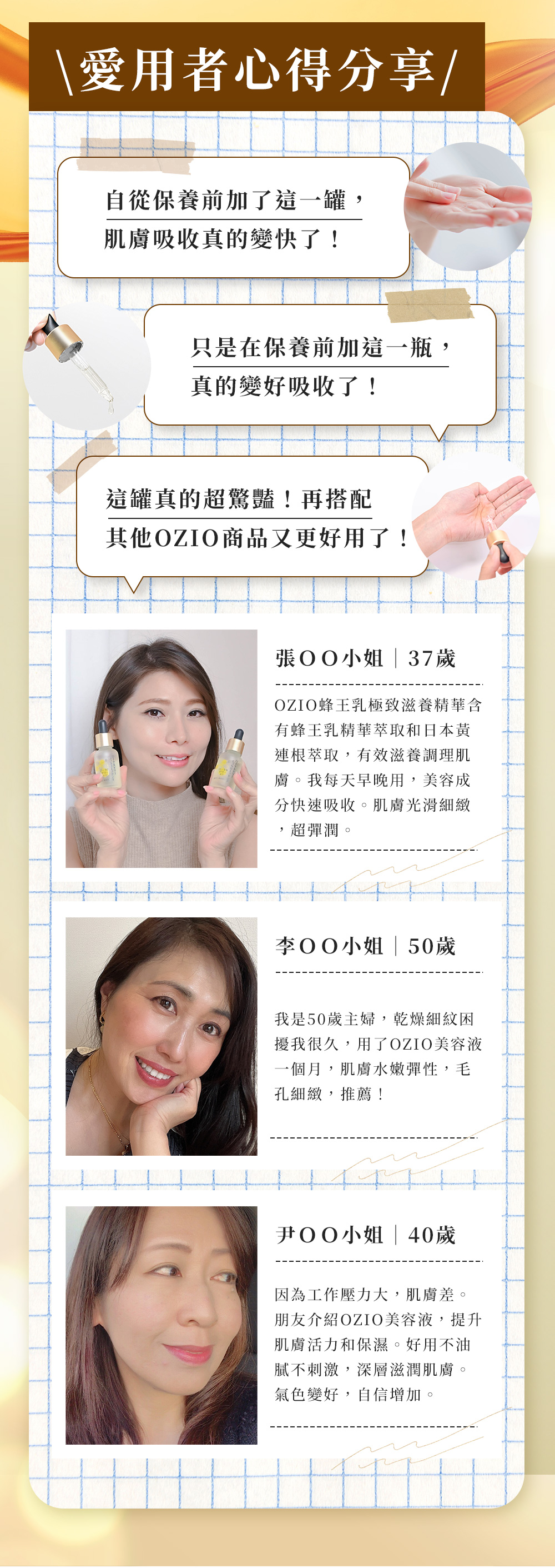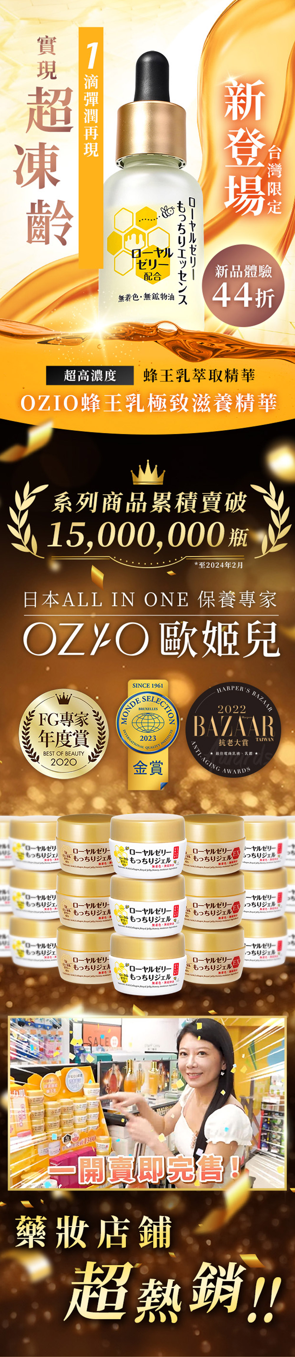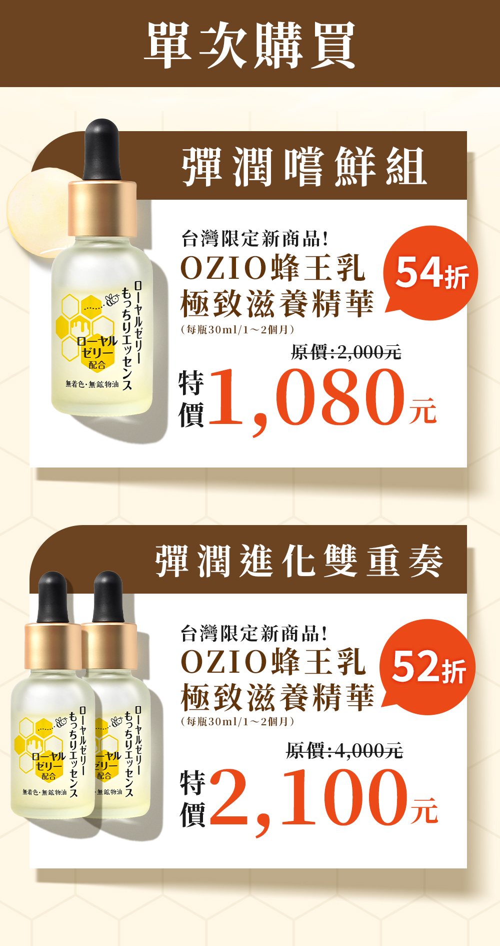 OZIO 蜂王乳極致滋養精華保養前加一滴、極致彈潤,實現超凍齡。搭配蜂王乳凝露效果更加乘。