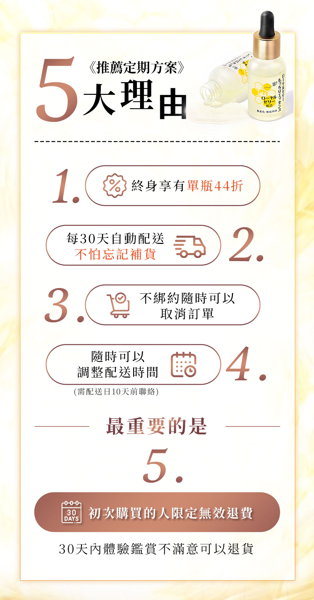 專為台灣熟齡肌女性開發,保養前加一滴、極致彈潤,實現超凍齡。搭配蜂王乳凝露效果更加乘。