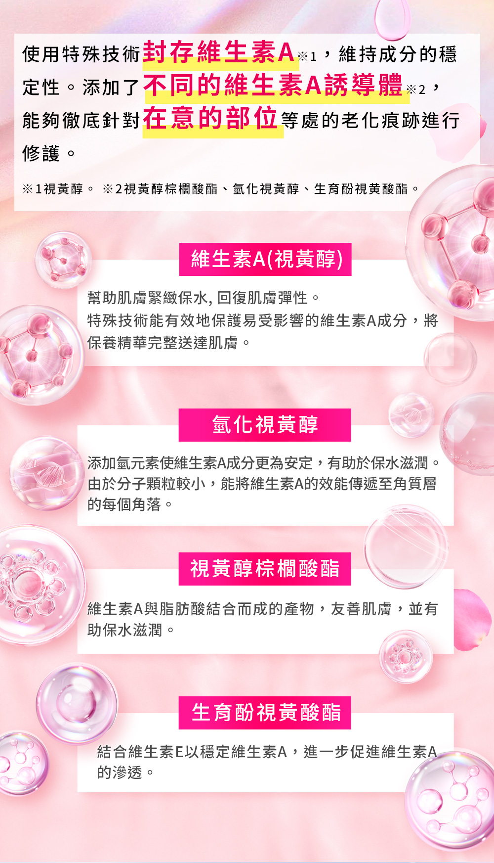 蘊含A醇能量的美容精華,調理乾燥造成的肌膚紋路,使肌膚恢復彈性與光澤。