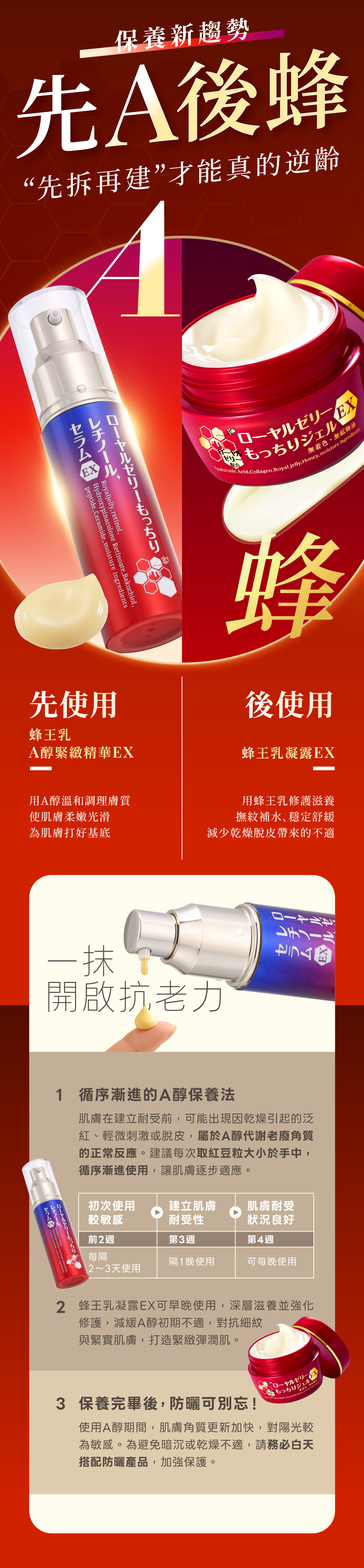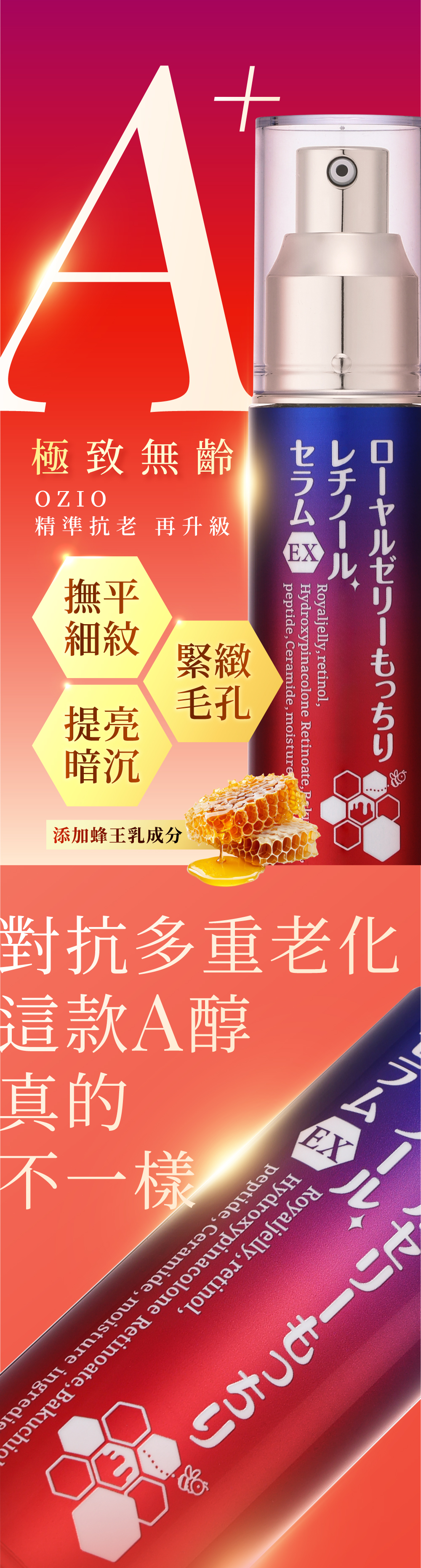 OZIO 蜂王乳A醇緊緻精華EX高效溫和型A醇精華乳,幫助代謝老廢角質,淡化細紋