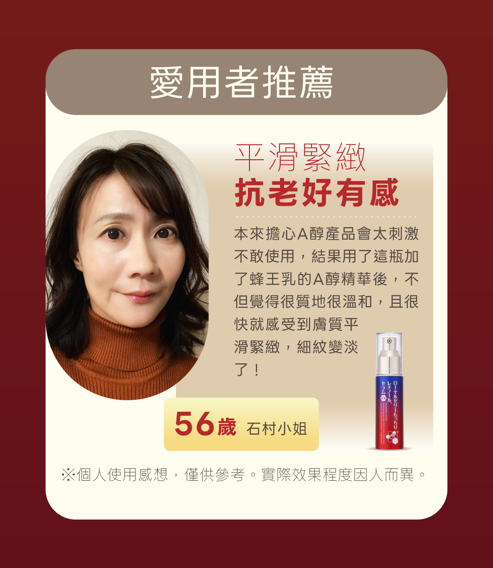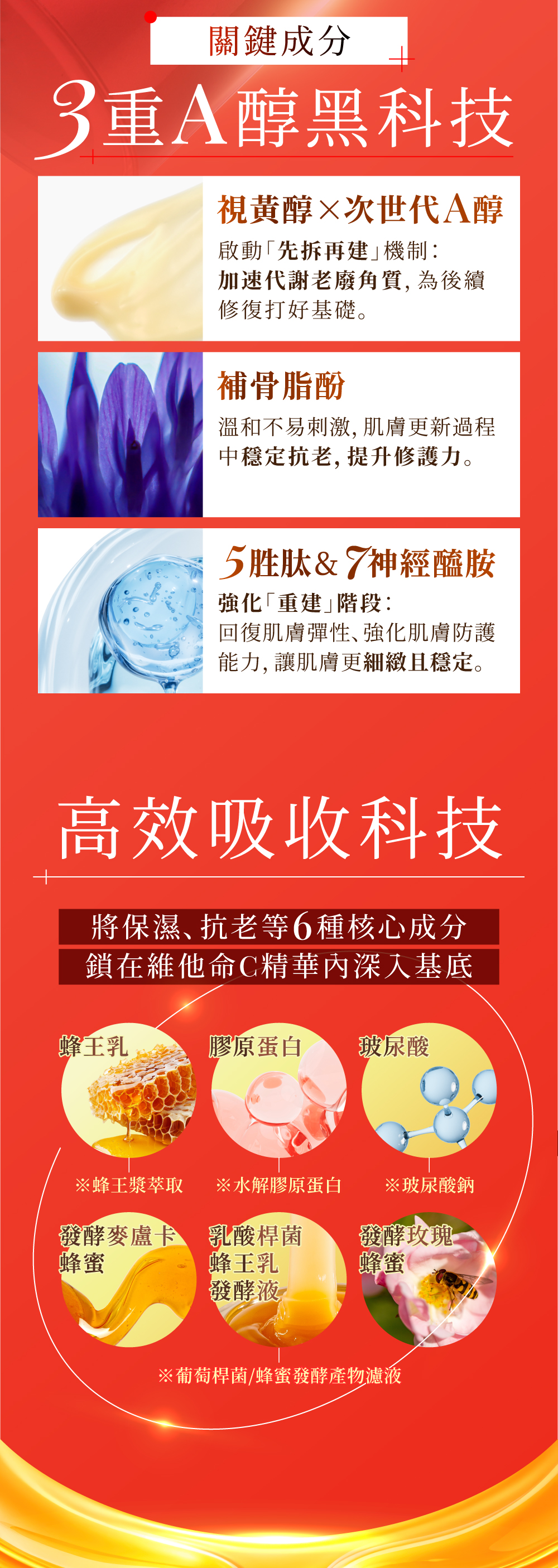 三重A醇青春配方:A醇0.3%+補骨脂酚+新世代A醇成分HPR,協同抗老保濕成分:「蜂王漿萃取」「5種胜肽」「7種神經醯胺」…等,幫助代謝老廢角質,改善毛孔粗大、淡化細紋,保濕鎖水,提升肌膚彈潤平滑與緊緻。